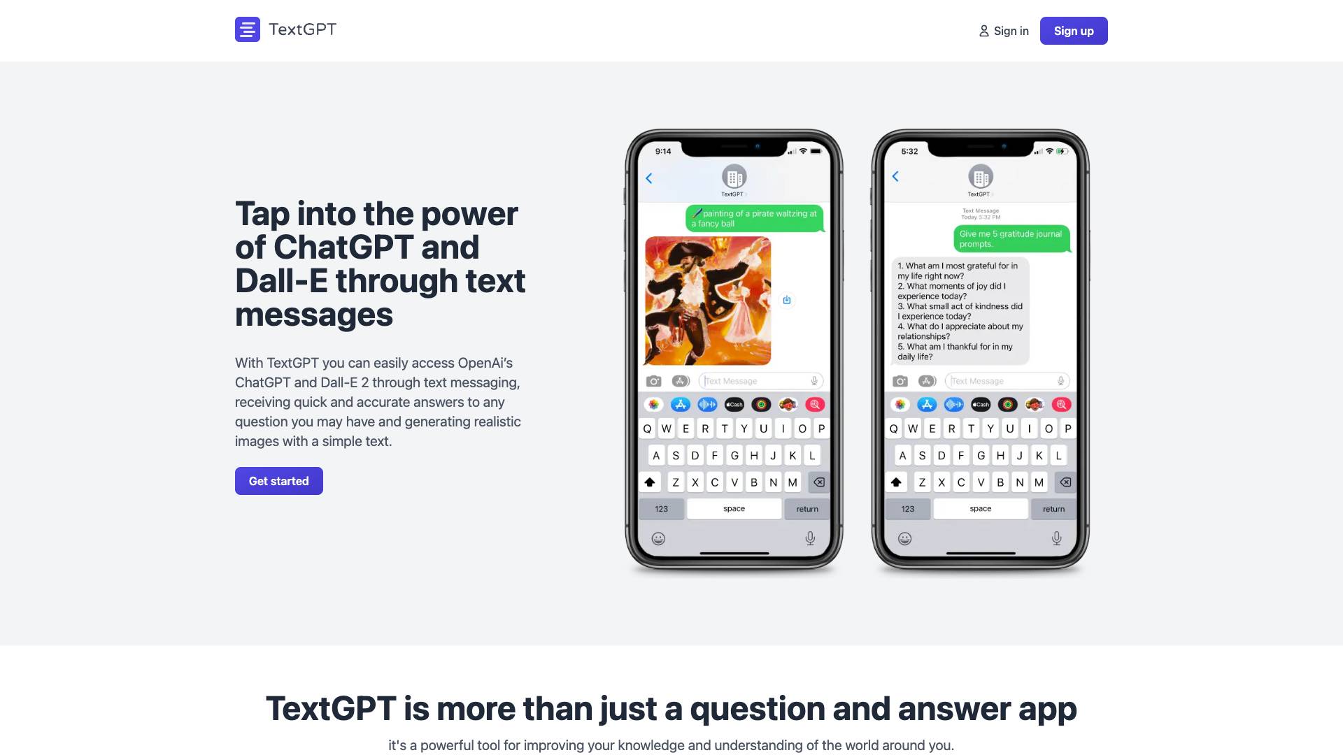 TextGPT is a texting app that lets users access ChatGPT and DALL-E for quick answers and image generation via simple text messages.