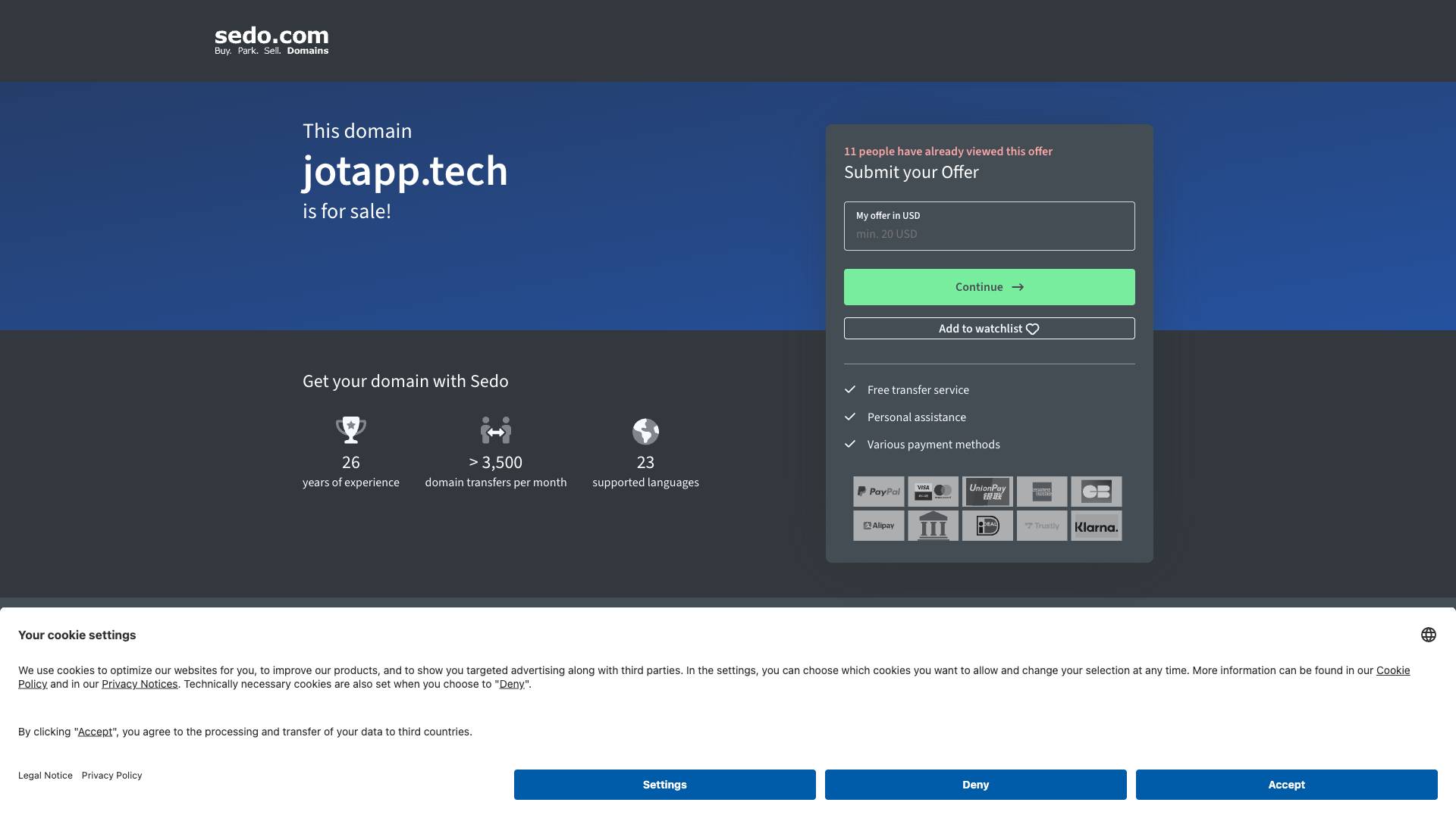 Jot is a domain for sale, offering a seamless transfer service with personal assistance and various payment methods.