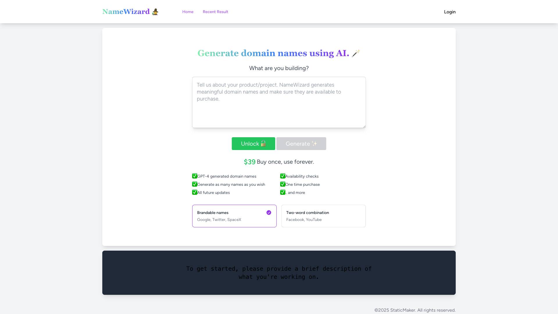 NameWizard uses AI to generate unique, brandable domain names with availability checks for a one-time purchase, ensuring endless creativity.