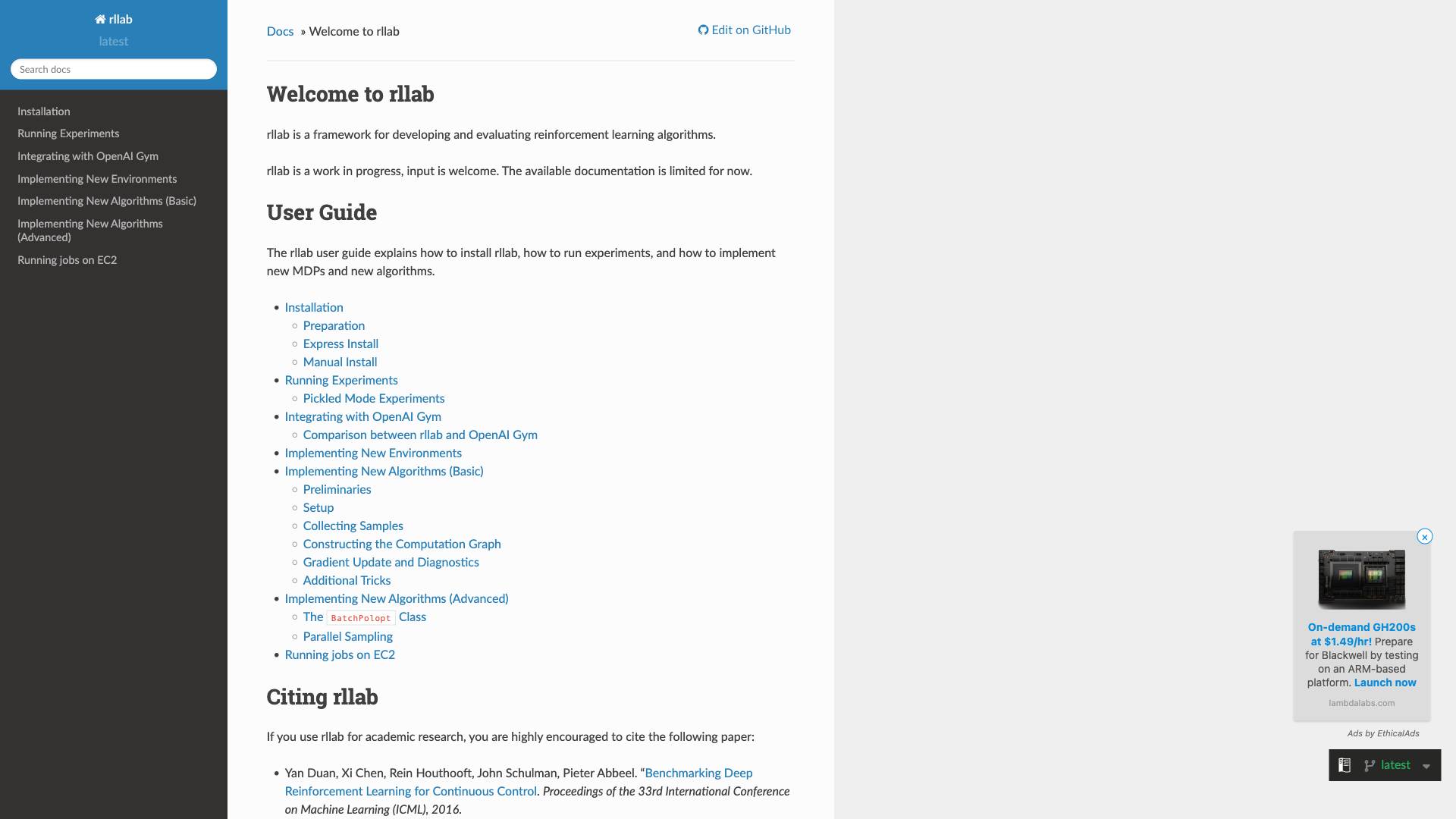 RLLab is a framework for developing and evaluating reinforcement learning algorithms, facilitating experimental runs and environment implementations.