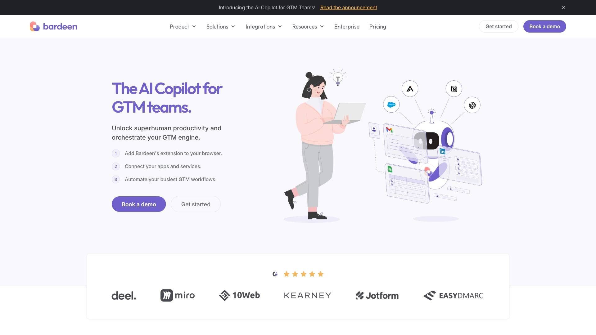 Bardeen AI is an automation platform that enhances GTM team productivity by streamlining workflows and integrating tools for supercharged efficiency.
