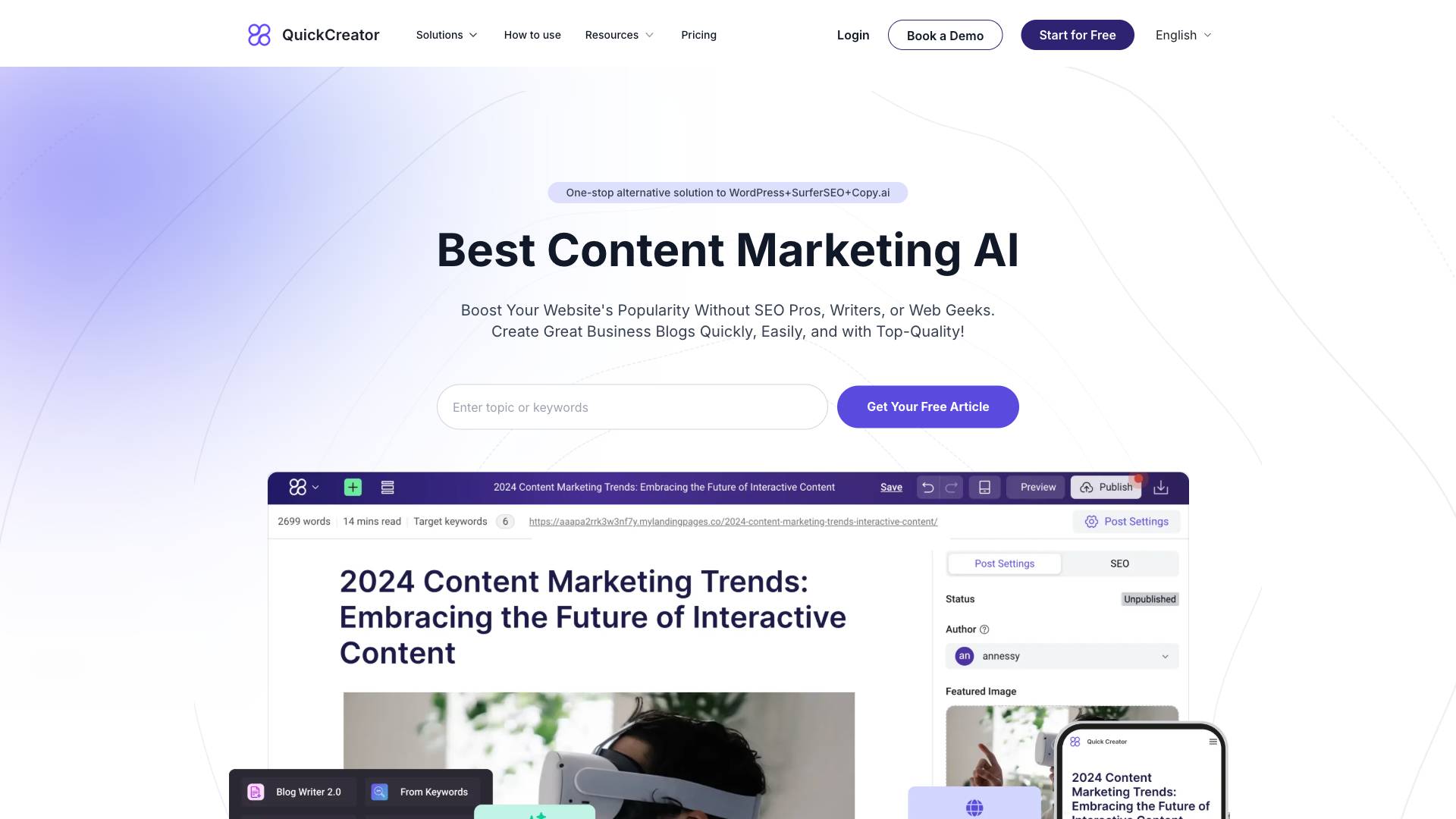 Quick Creator is an AI-powered blogging platform that simplifies content creation and SEO optimization, enabling anyone to craft high-quality blogs effortlessly.