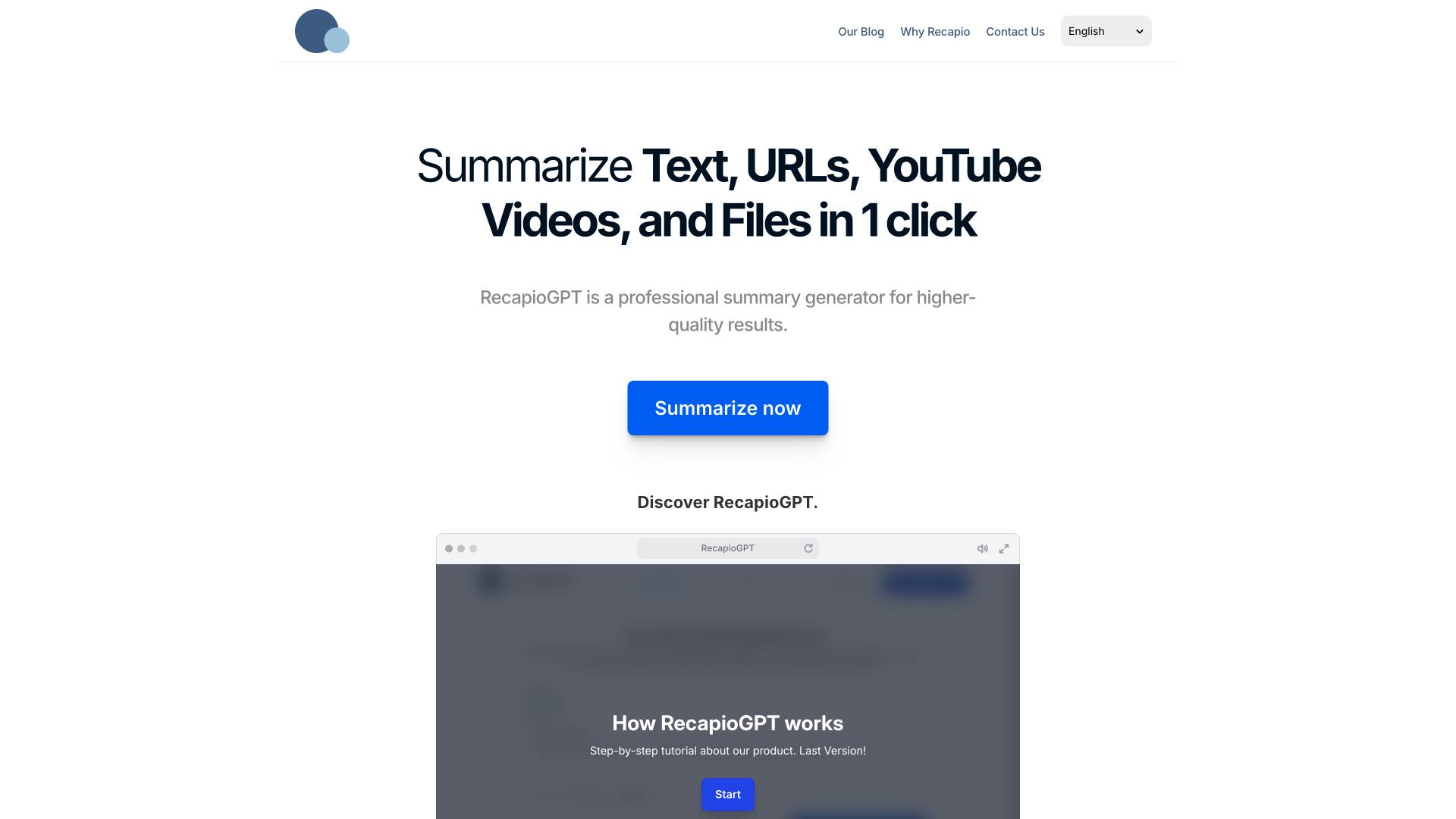 RecapioGPT is a professional summary generator that effortlessly condenses text, URLs, YouTube videos, and files with a single click.